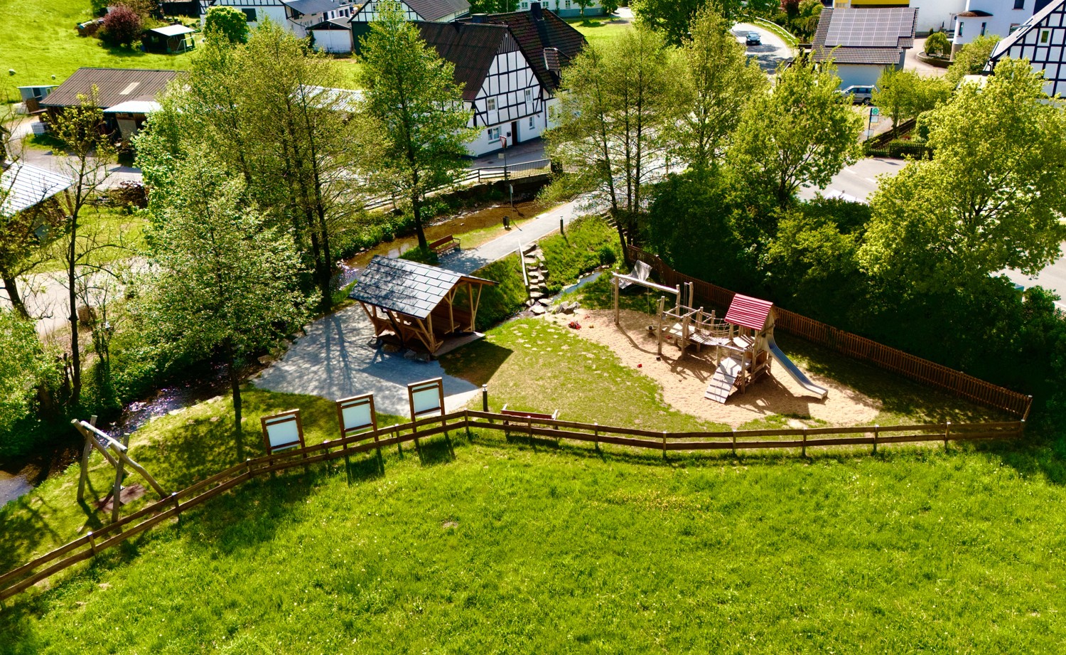 Ein liebevoll gestalteter Spielbereich mit Spielturm, Wasserlauf und viel Raum zum Toben, ergänzt durch eine offene Schutzhütte mit schwebendem Tisch und Bänken – direkt über dem idyllischen Mühlengraben.